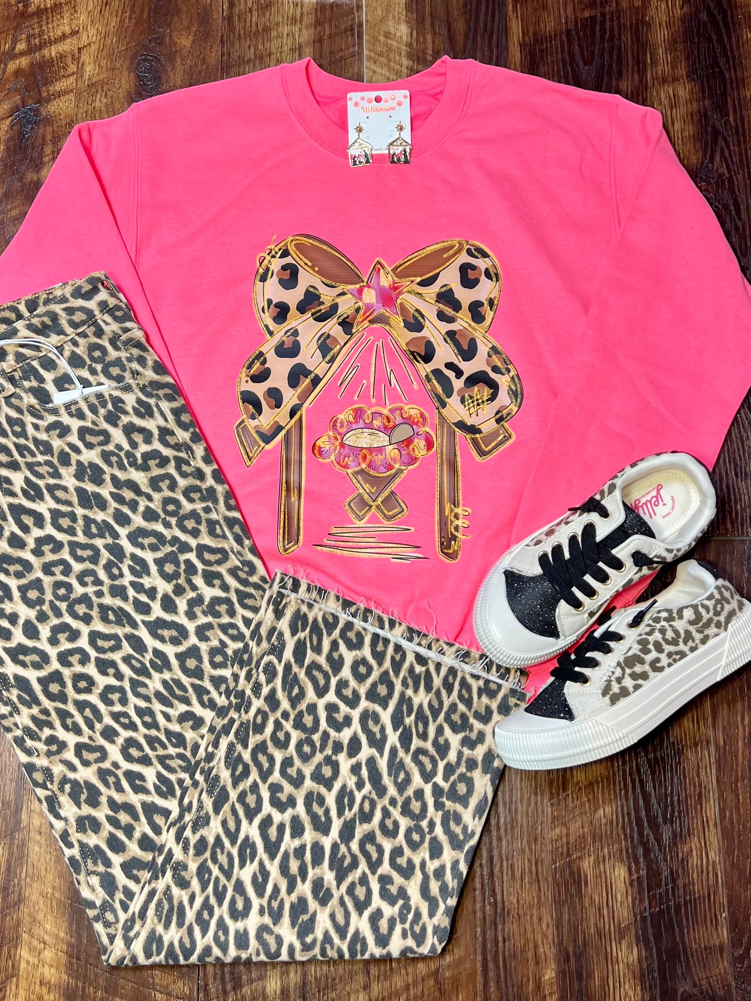 Safety pink Gildan heavy blend 50/50 fleece crewneck with a beautiful leopard print bow & Christmas manger design
