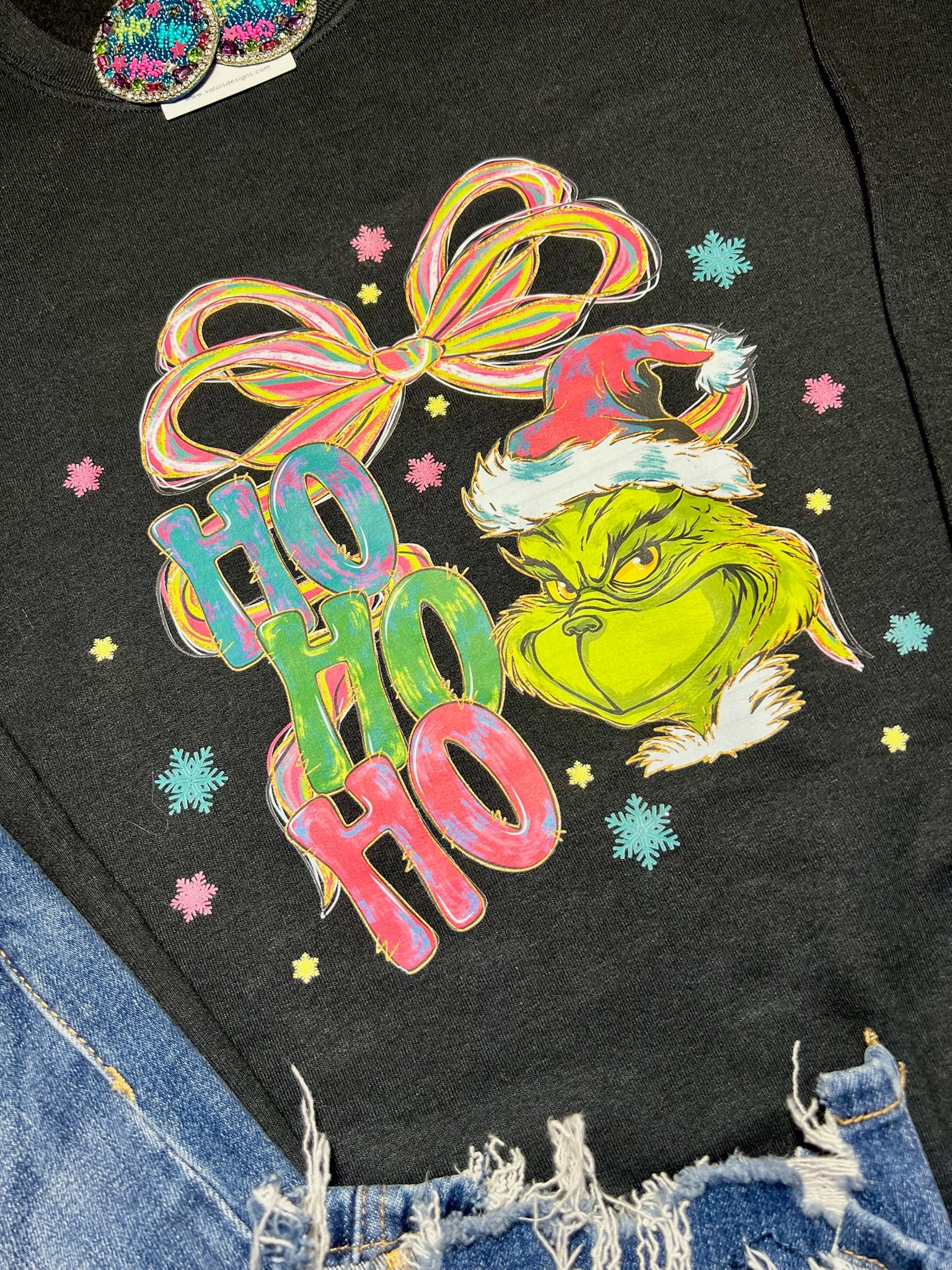 Black jerzees nublend fleece crewneck with a colorful coquette Christmas Grinch design