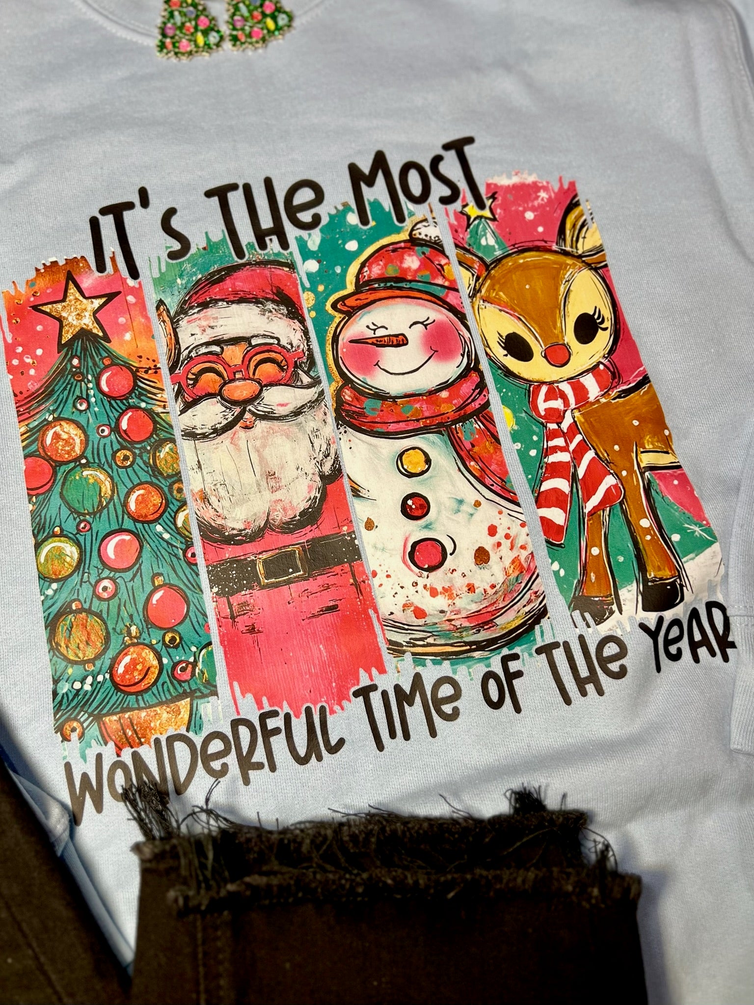 Light blue Gildan heavy blend 50/50 fleece crewneck with a preppy Christmas tree, Santa, Snowman, and reindeer design