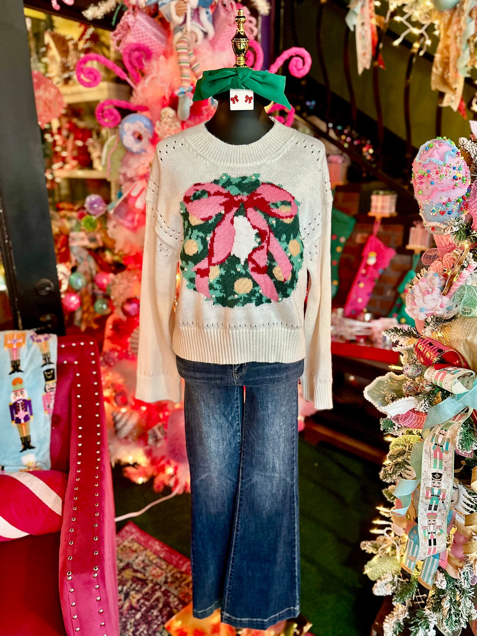 Beautiful ivory knit sweater with a Christmas wreath design and pearl embellishments