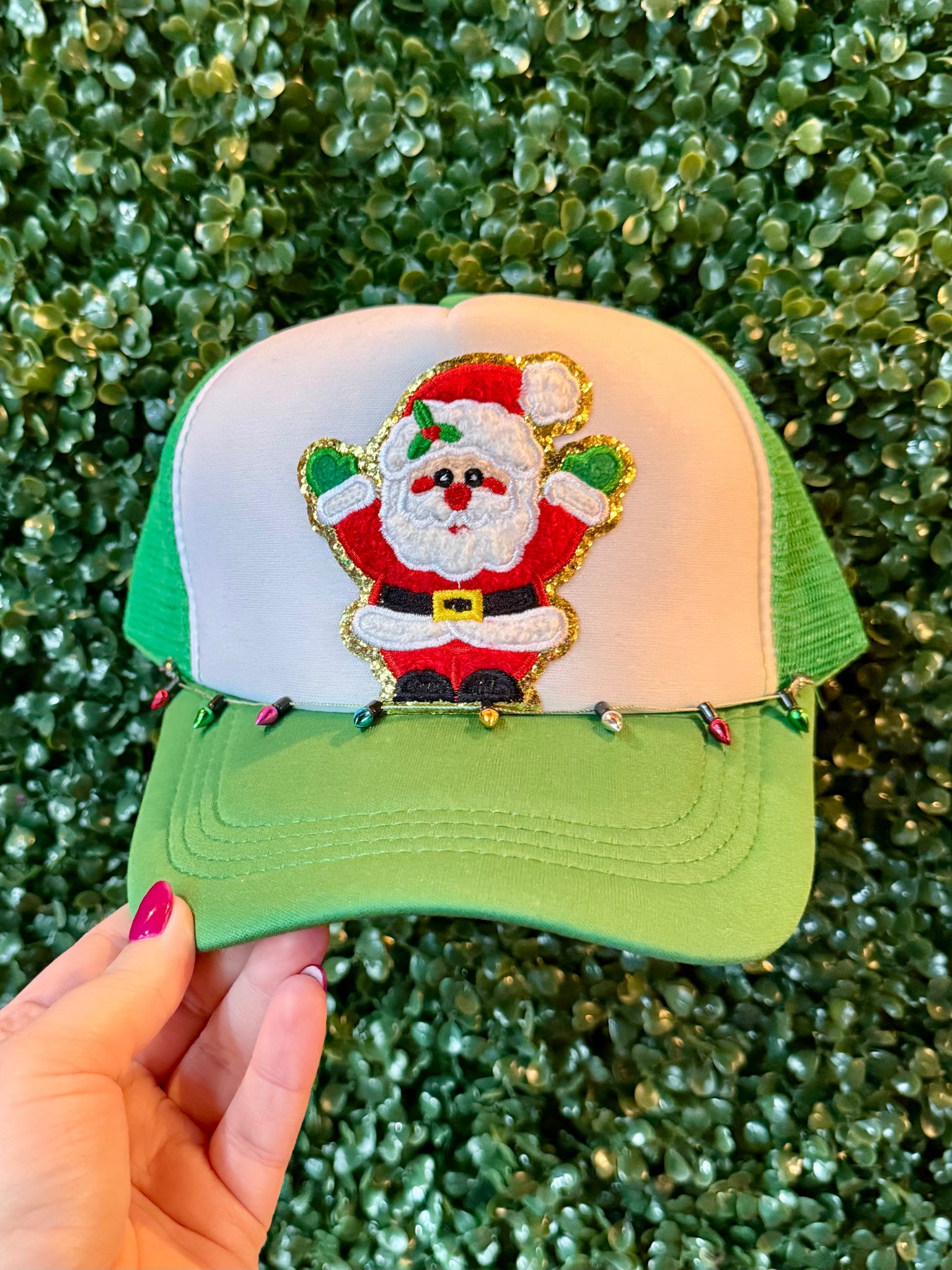 Green & white mesh-back hat with a gold outlined Santa patch and a super cute string of Christmas lights