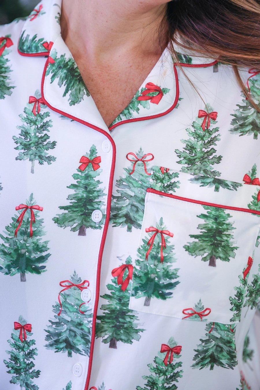 Celebrate the season in the Under the Tree Ruffle Pajama Set, featuring festive Christmas trees and bright red bows. This classic, timeless design pairs a long-sleeve top with comfy shorts for holiday cheer and cozy nights.