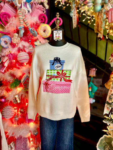Christmas Light Ribbon Bow Embroidered Crewneck