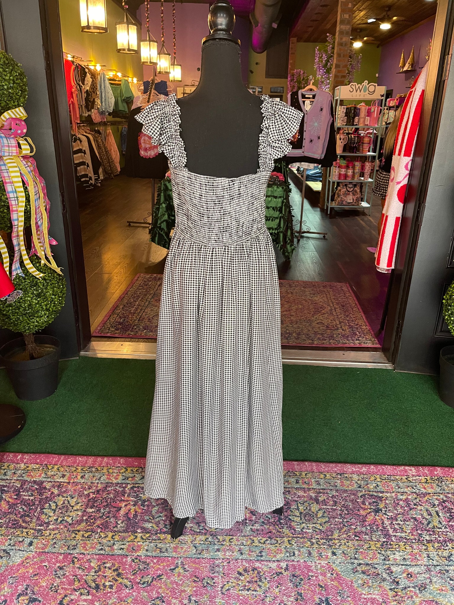 This beautiful midi dress features an A line shape, square neckline, short ruffle sleeves, smocked bodice, front bow detail, and an interior lining