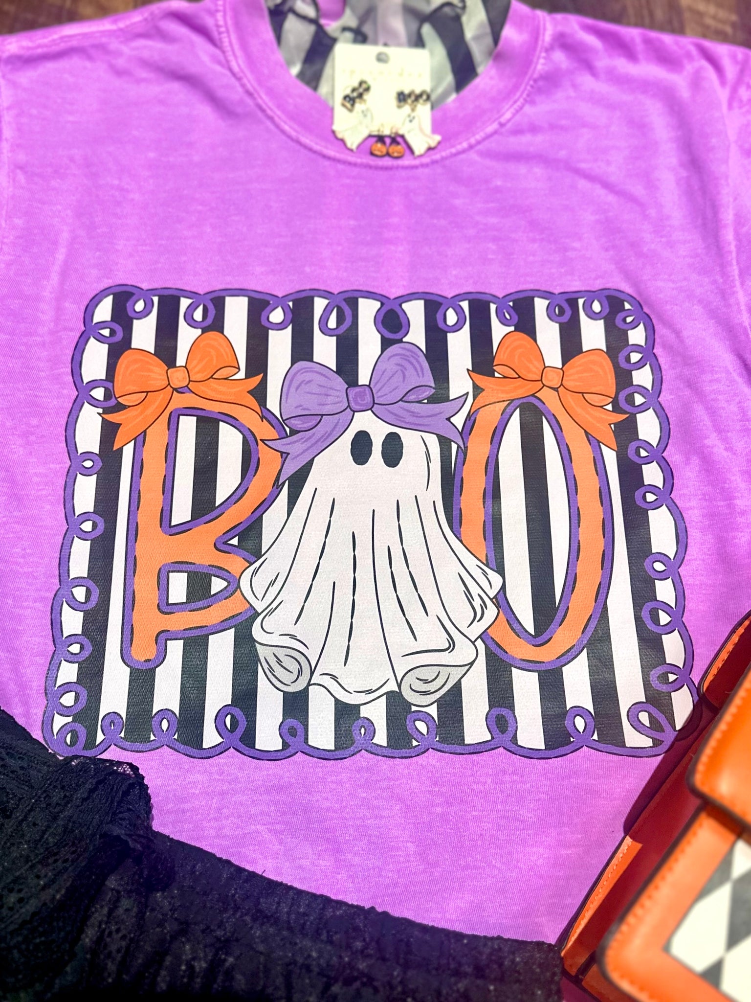 Comfort Colors Neon Violet Unisex Heavyweight tee with a cute striped print with BOO and a cutesy ghost