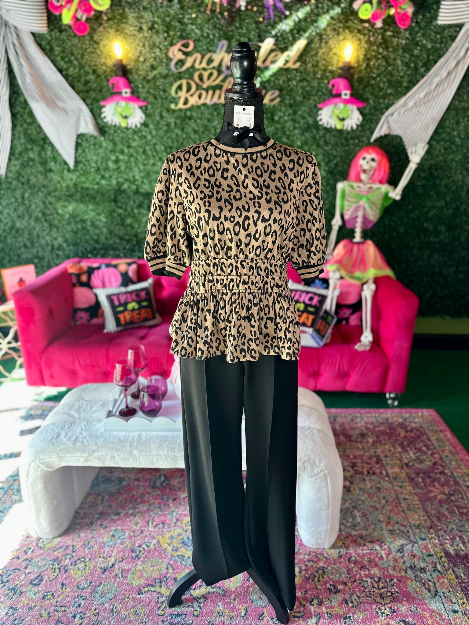 Puff sleeve leopard print knit peplum top with contrast rib arm band and elastic waist band