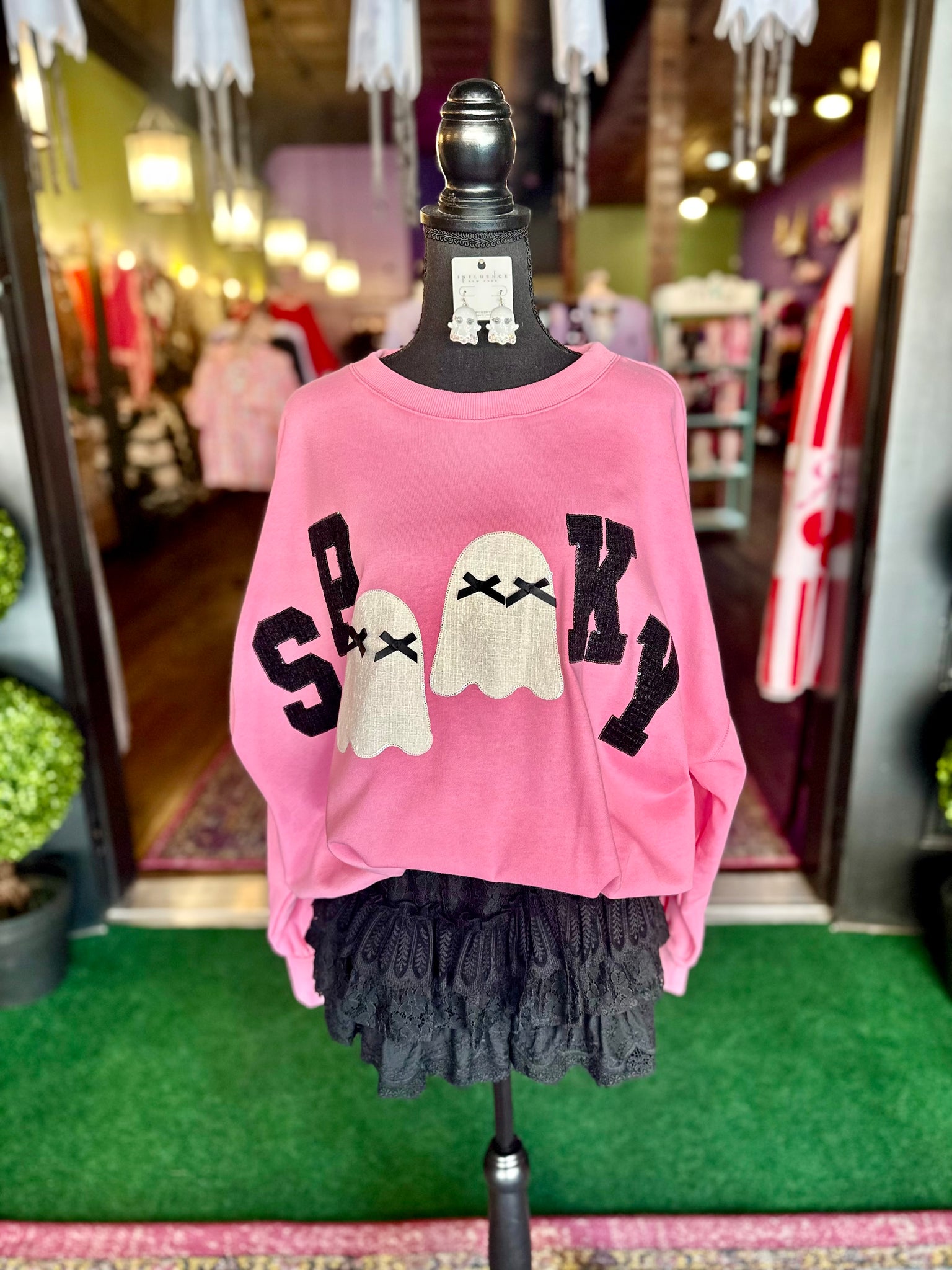 Super cute, oversized, pink sweatshirt with tweed patch letters and ghosts with a sequin outline.