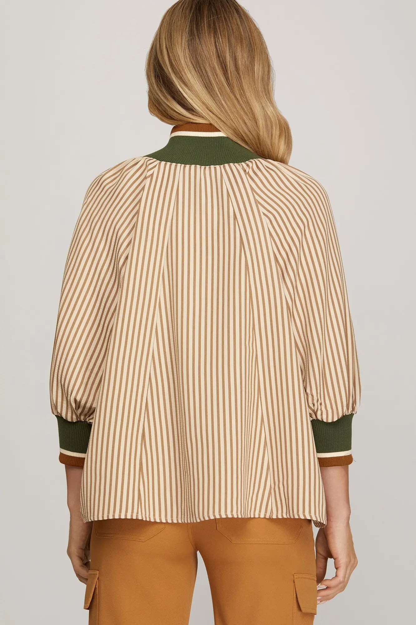 Striped top with 3/4 sleeves and contrast ribbed bands at the neckline and sleeve ends.