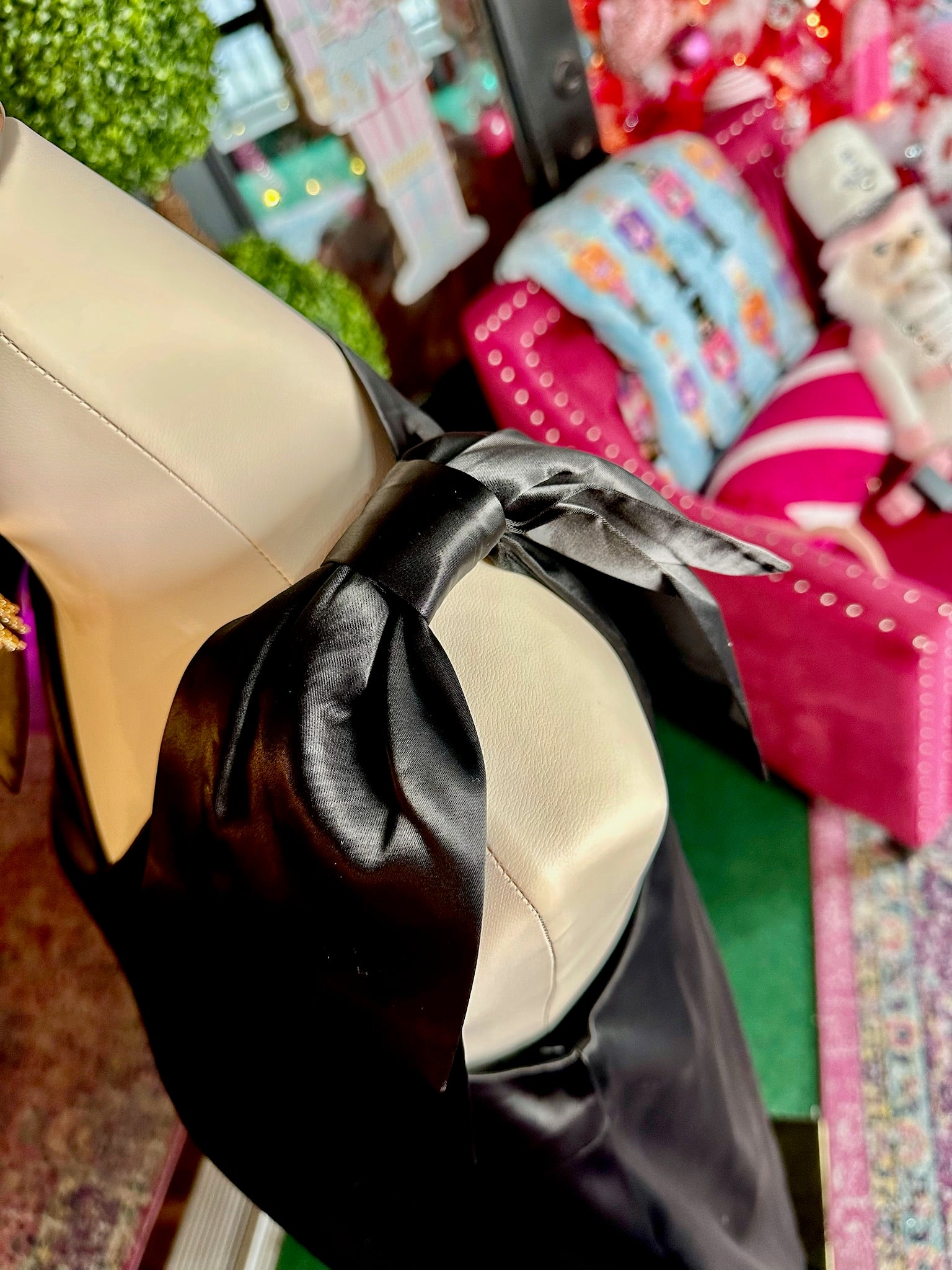 Satin-like beautiful black sleeveless v-neck dress with bows at the shoulders. Has an interior lining, is non-sheer, and has pockets!!