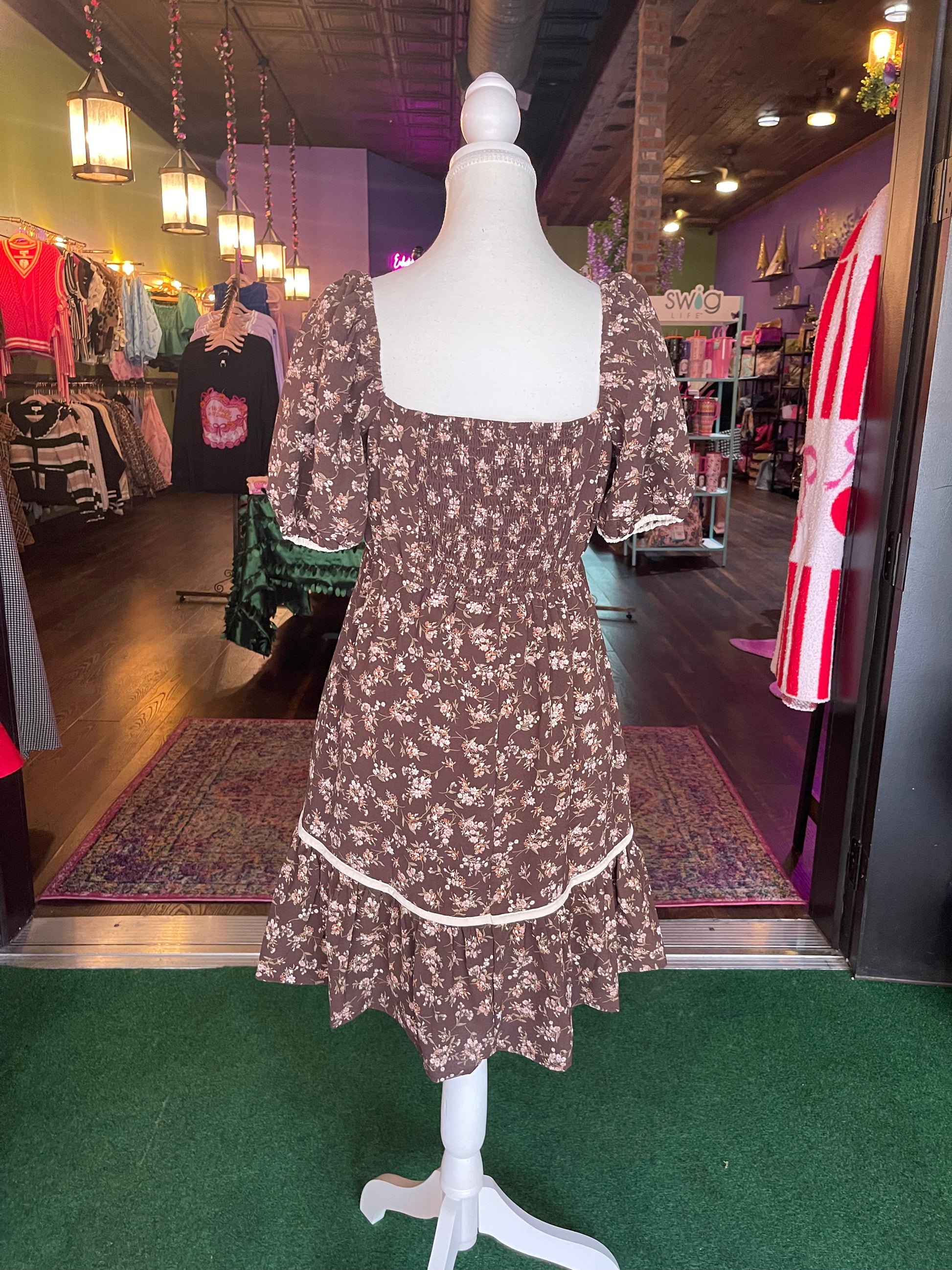 Features a square neckline, short puff sleeves, contrast trim detail, back smocking, ruffle hem, floral pattern, and interior lining.
