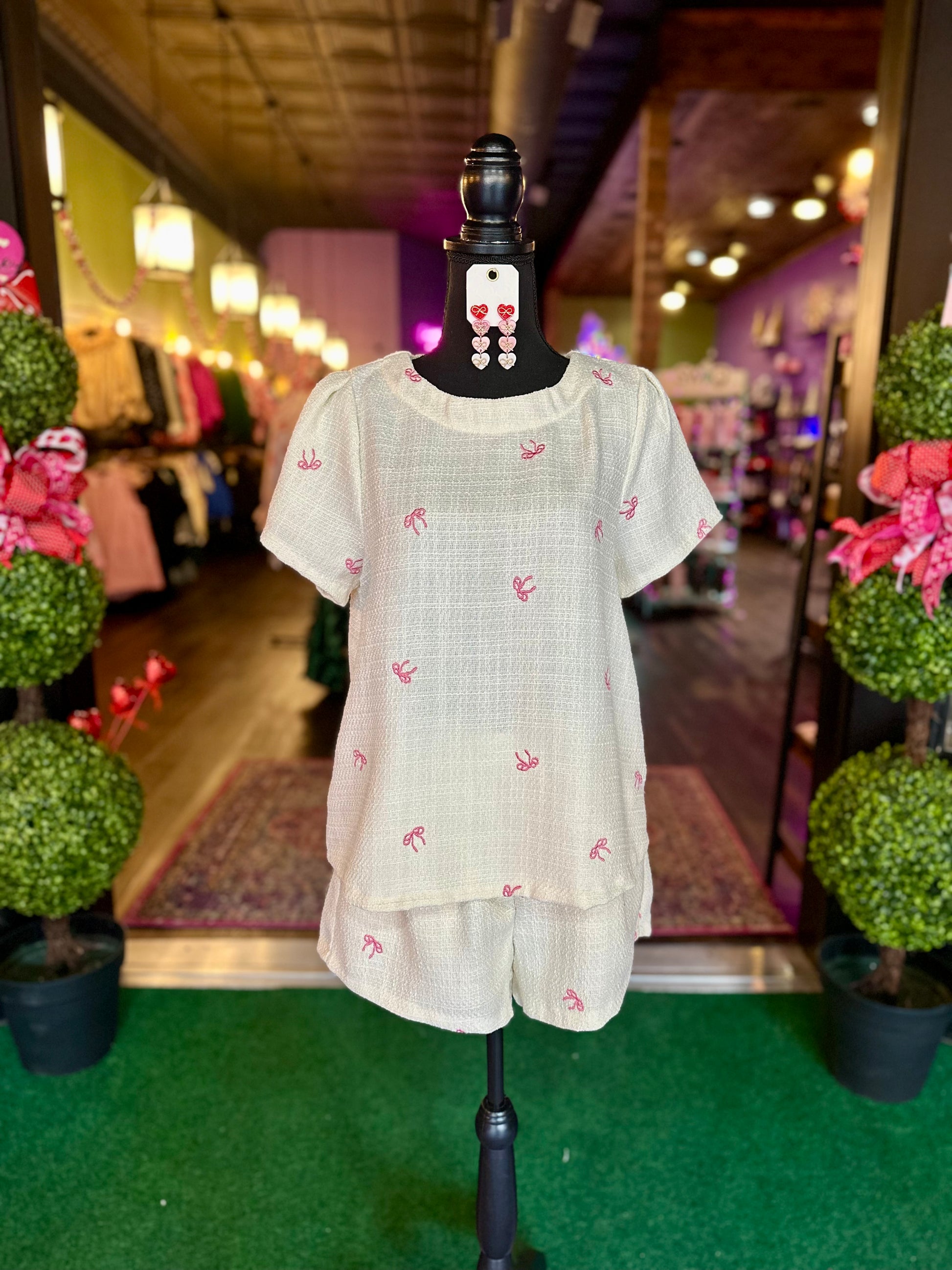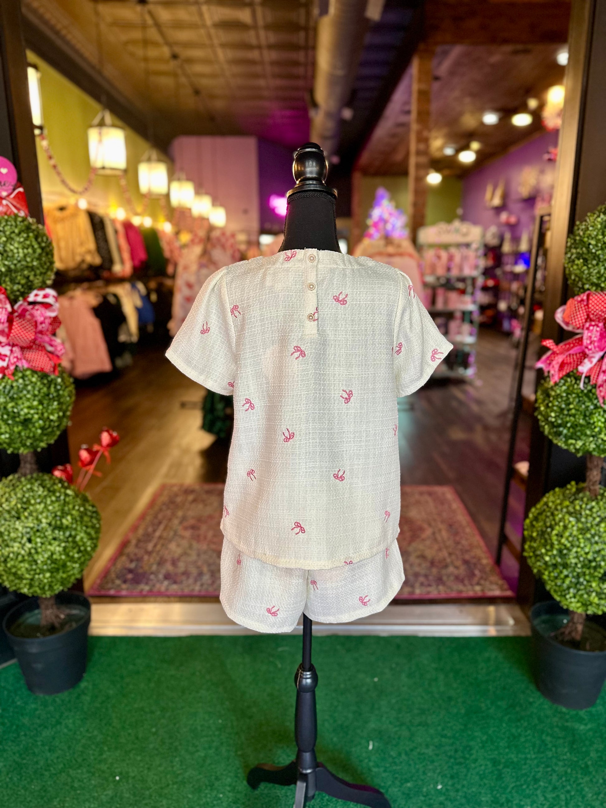 Super cute tweed shirt and shorts set with pink ribbon embroidery