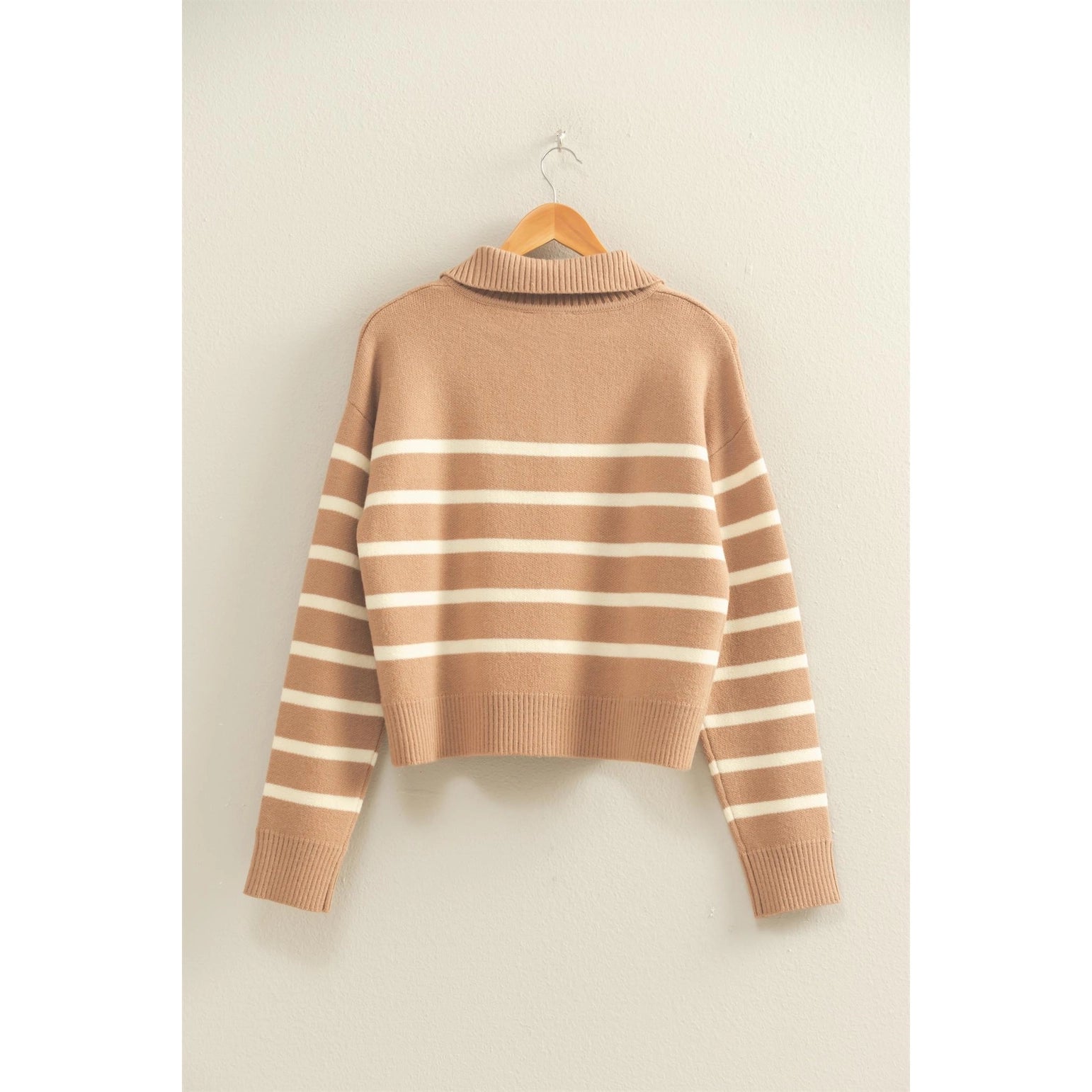 Elevate your casual wardrobe with this half-zip sweater featuring a classic stripe pattern and a high neckline. The knit has a structured feel that holds its shape while remaining comfortable. Perfect for layering over a tee or under a coat, and easy to pair with jeans or tailored pants for a polished everyday look.