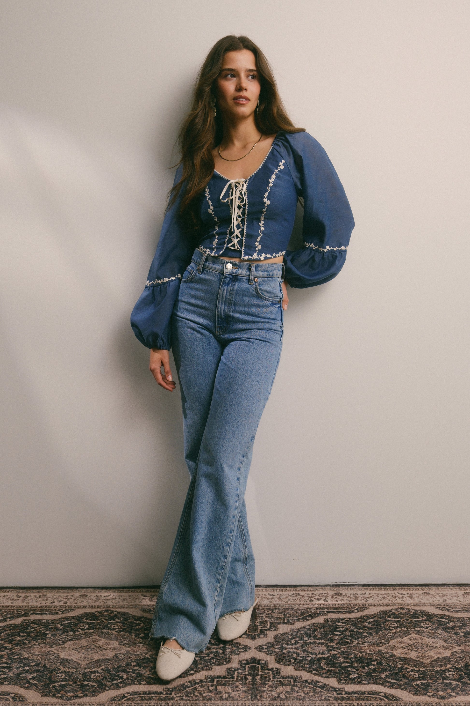 Denim Blue Lace-Up Embroidered Puff Sleeve Top