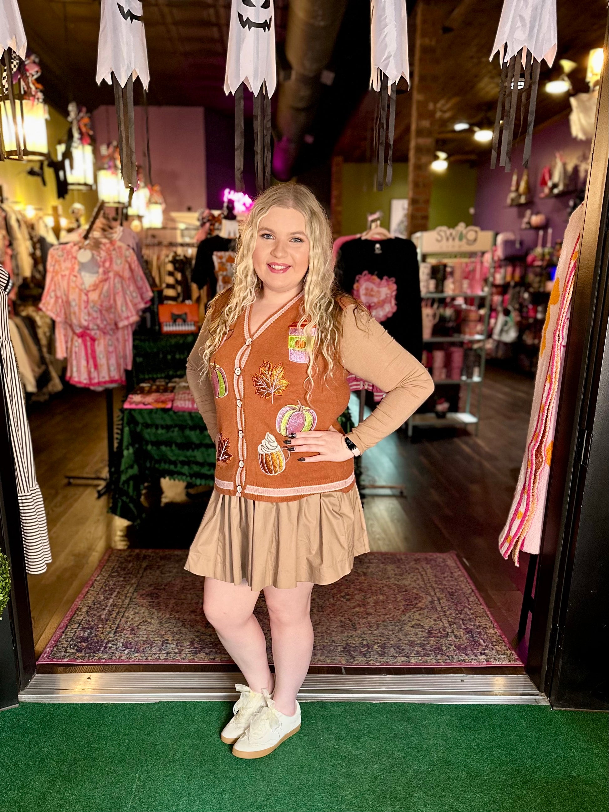 Cozy up to fall with this charming sweater vest featuring embroidered glitter patches that celebrate the season in style. The high-stretch knit offers a comfortable fit, while the classic V-neckline and button-front closure make it easy to layer over your favorite basics.