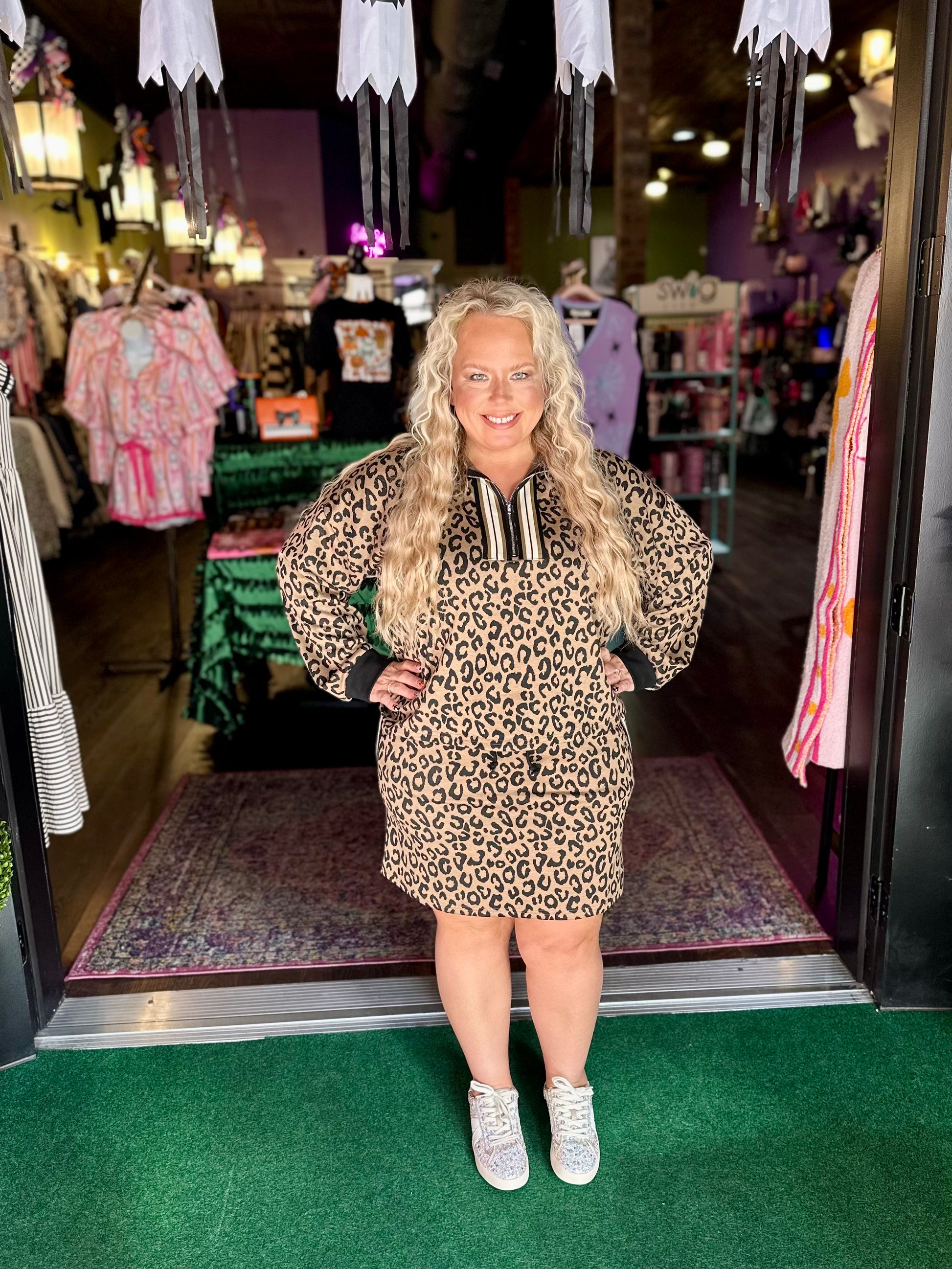 Long sleeve Leopard knit half zip with rib band detail paired with the matching skirt that features a drawstring waist, side band detail, and pockets!