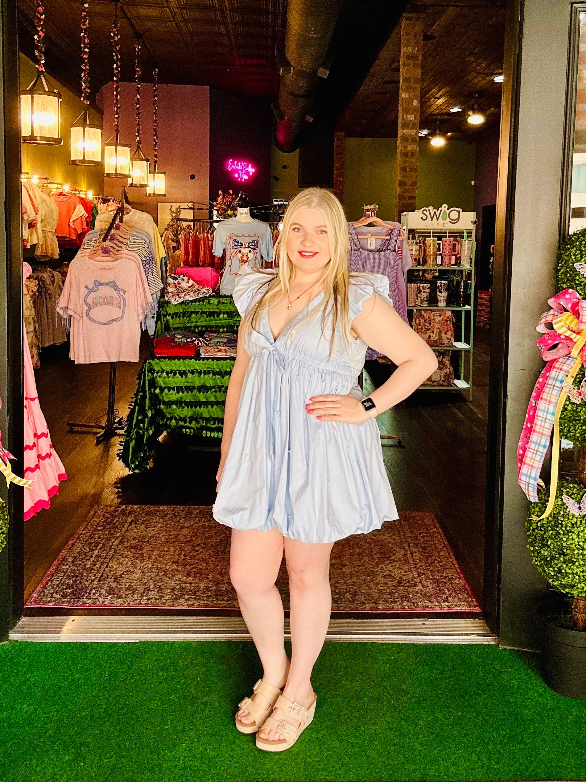 Super cute cotton poplin mini dress with pearls on the front, V-neckline, bubble hem, and cute bow detail
