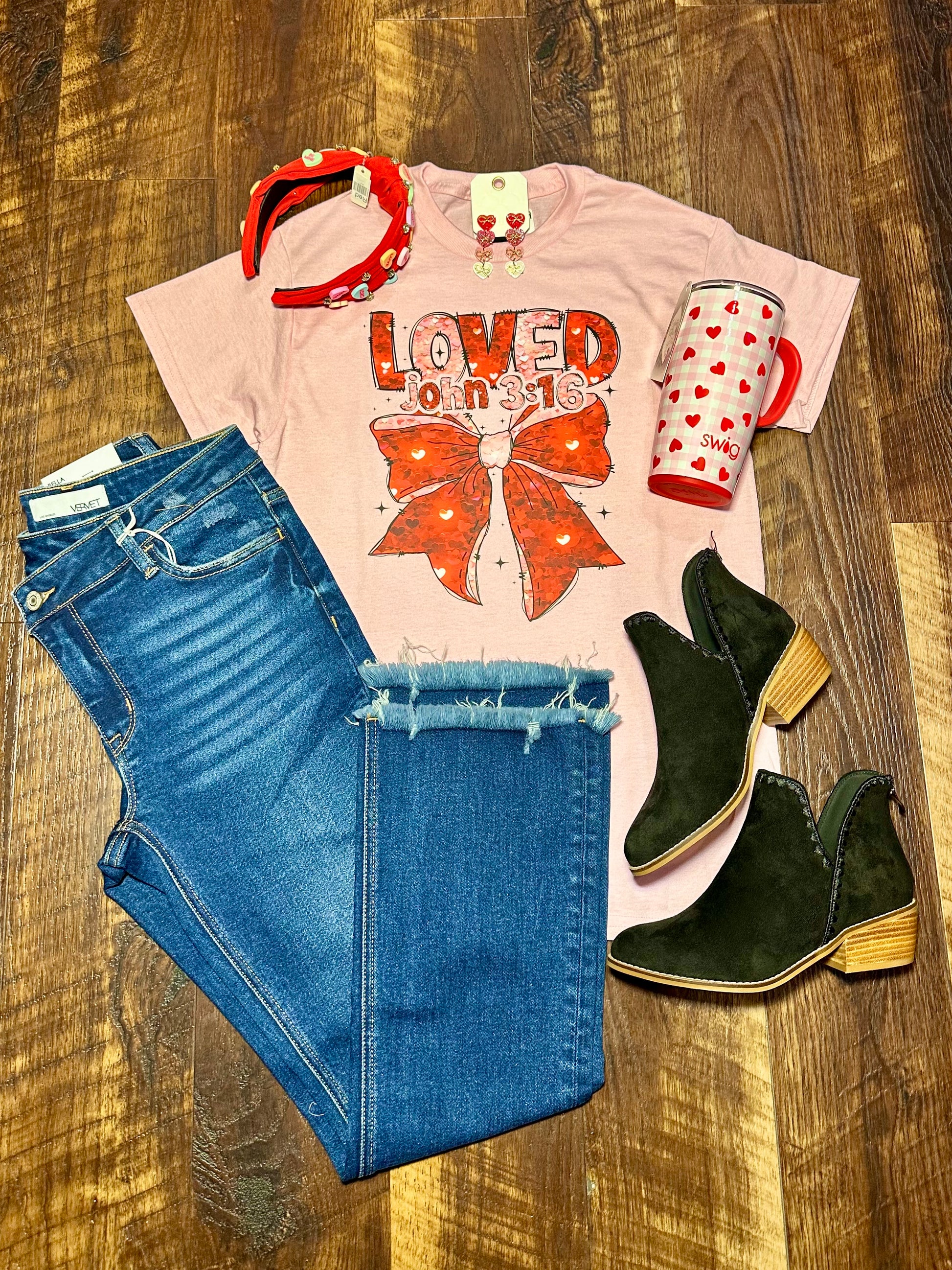 Light pink tee with pink and red LOVED JOHN 3:16 and a bow