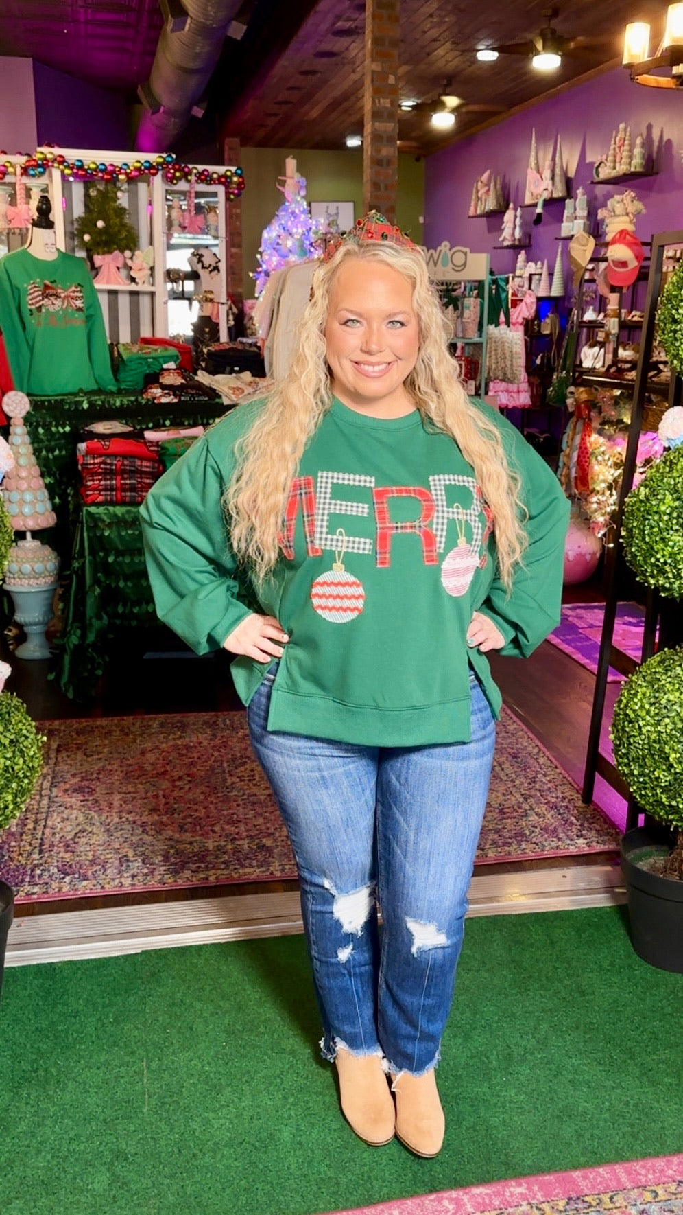 Super cute plaid patchwork lettering and ornaments design on a comfy oversized pullover