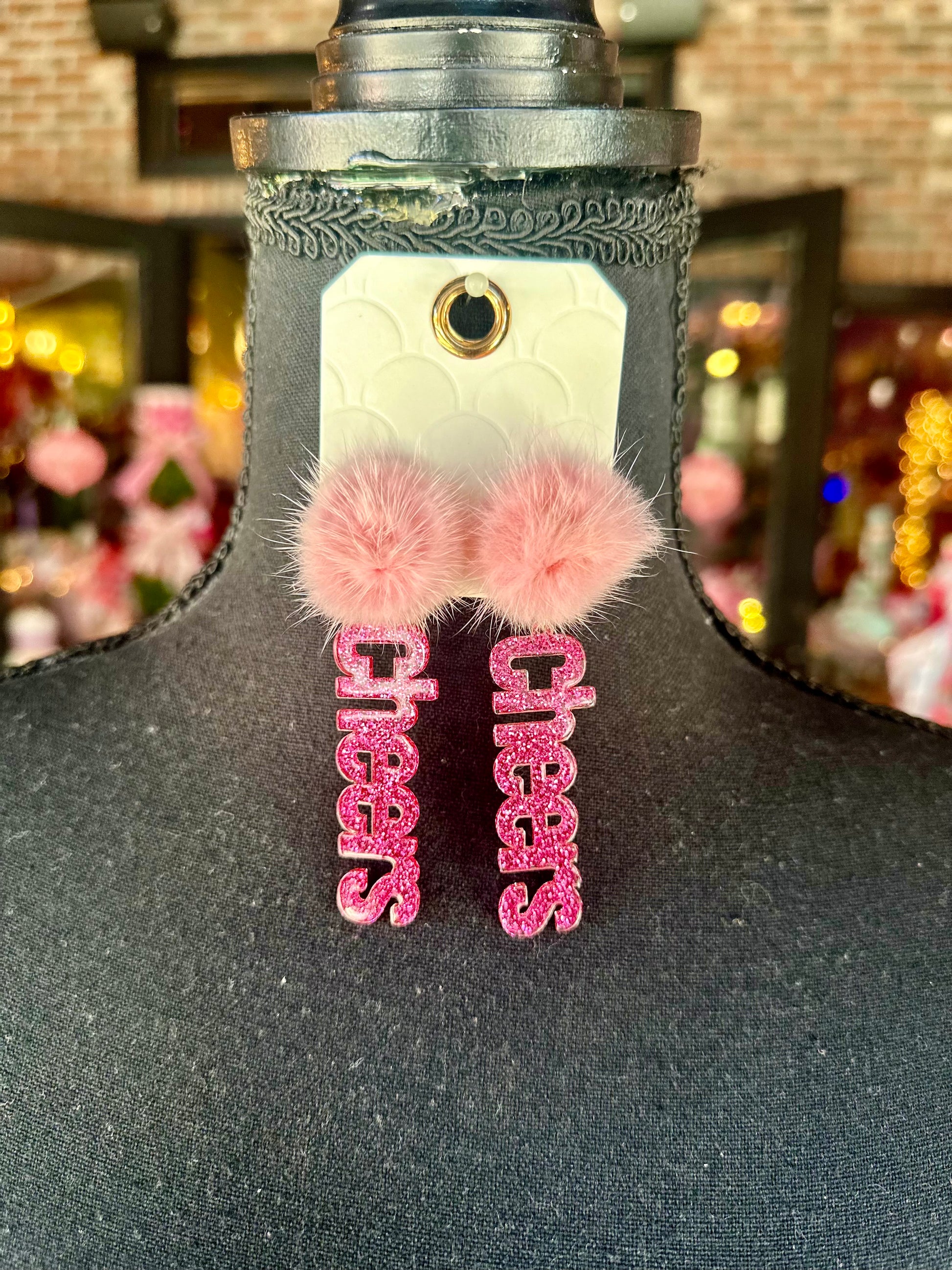 Stud-type, lightweight, acrylic, hanging fuchsia glitter “Cheers” earrings with light pink pompom