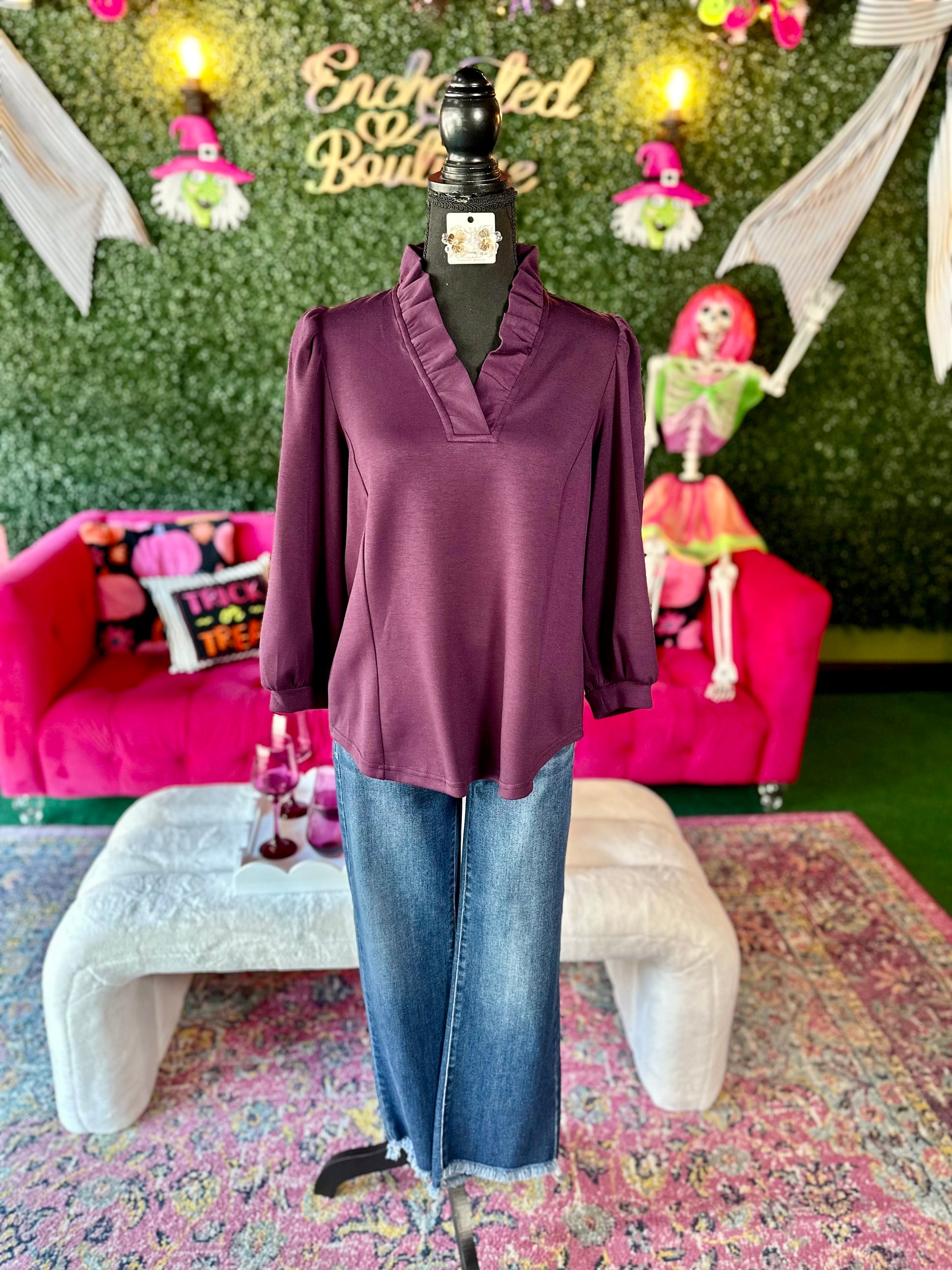 Plum Luxeknit Puff Sleeve Ruffle Neck Blouse