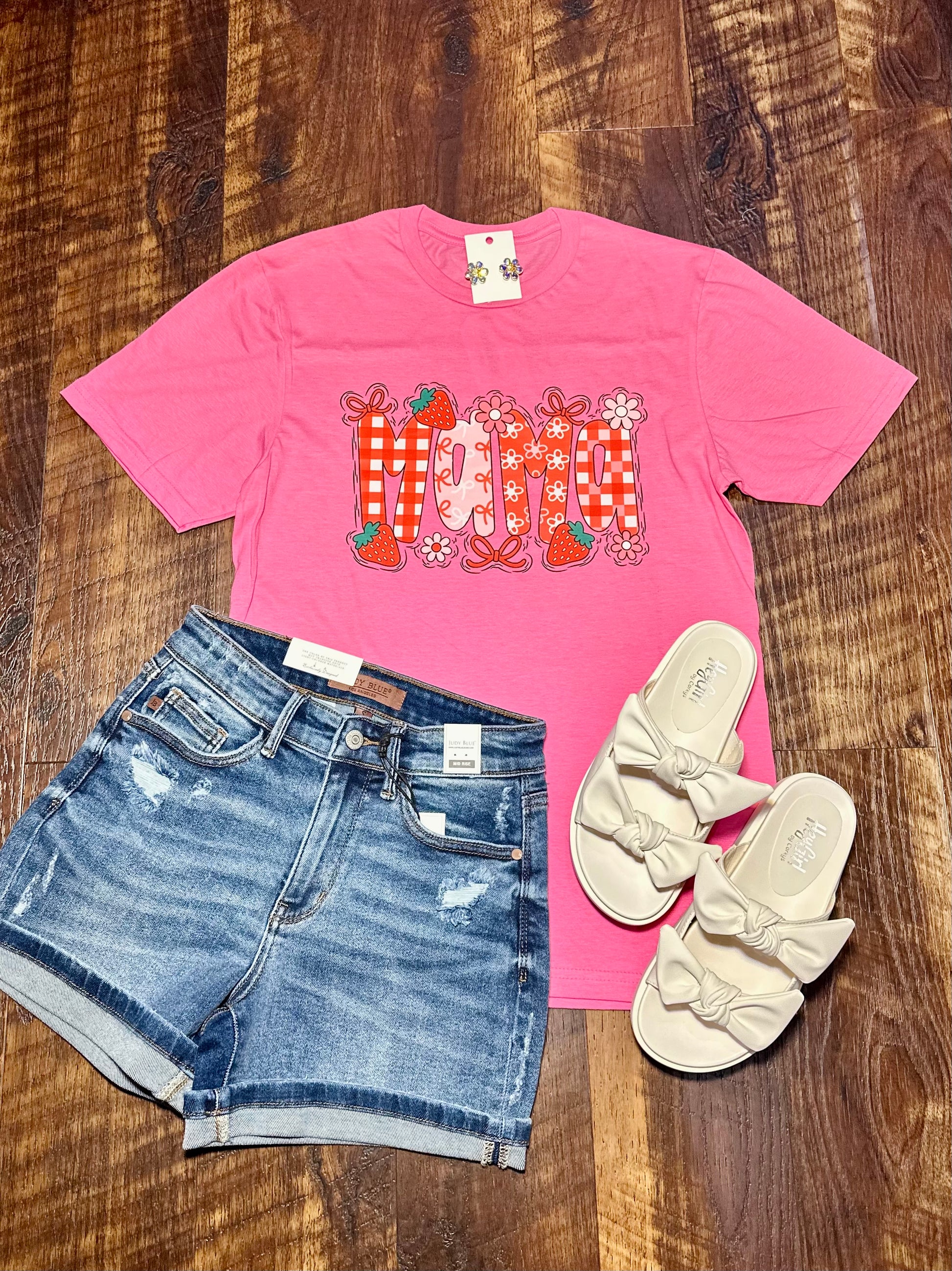 Super cute coquette floral, bow, and picnic plaid patterned lettering on an azalea pink Gildan Softstyle Unisex tee
