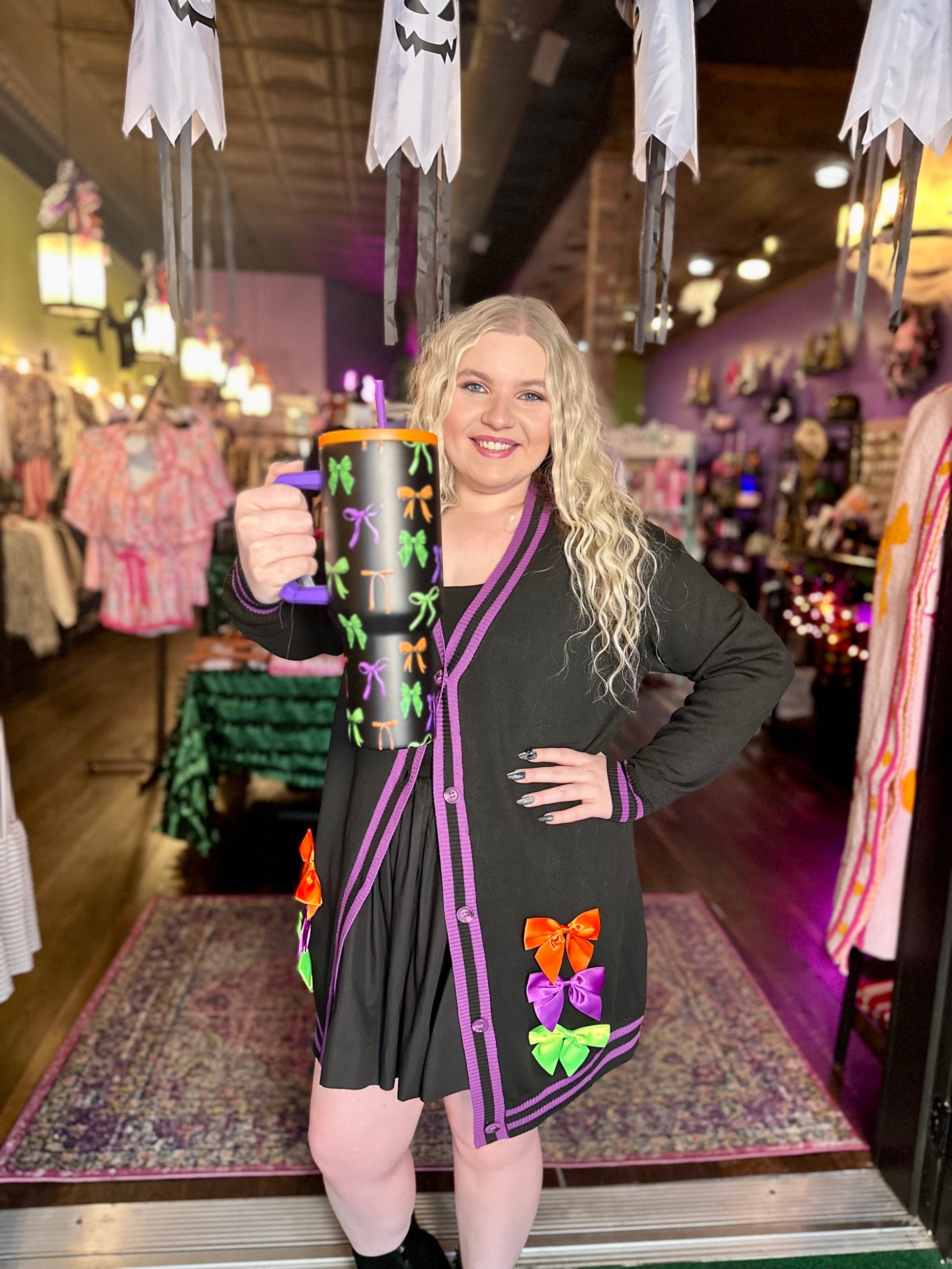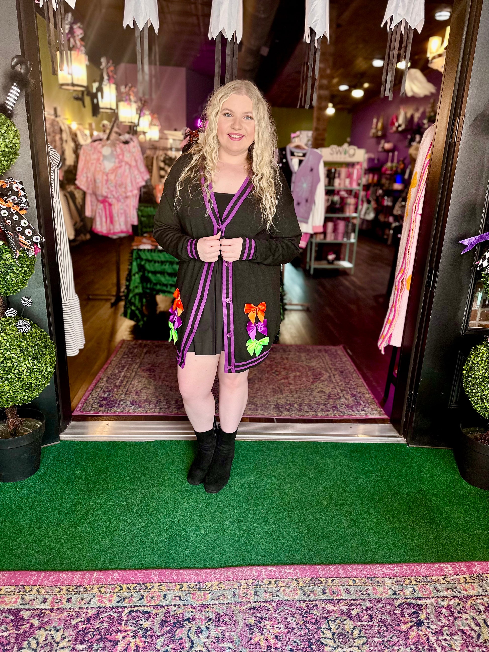 Lightweight yet cozy, this cardigan features functional buttons and playful satin bow accents. Perfect for layering and bringing some festive fun to your fall outfits.