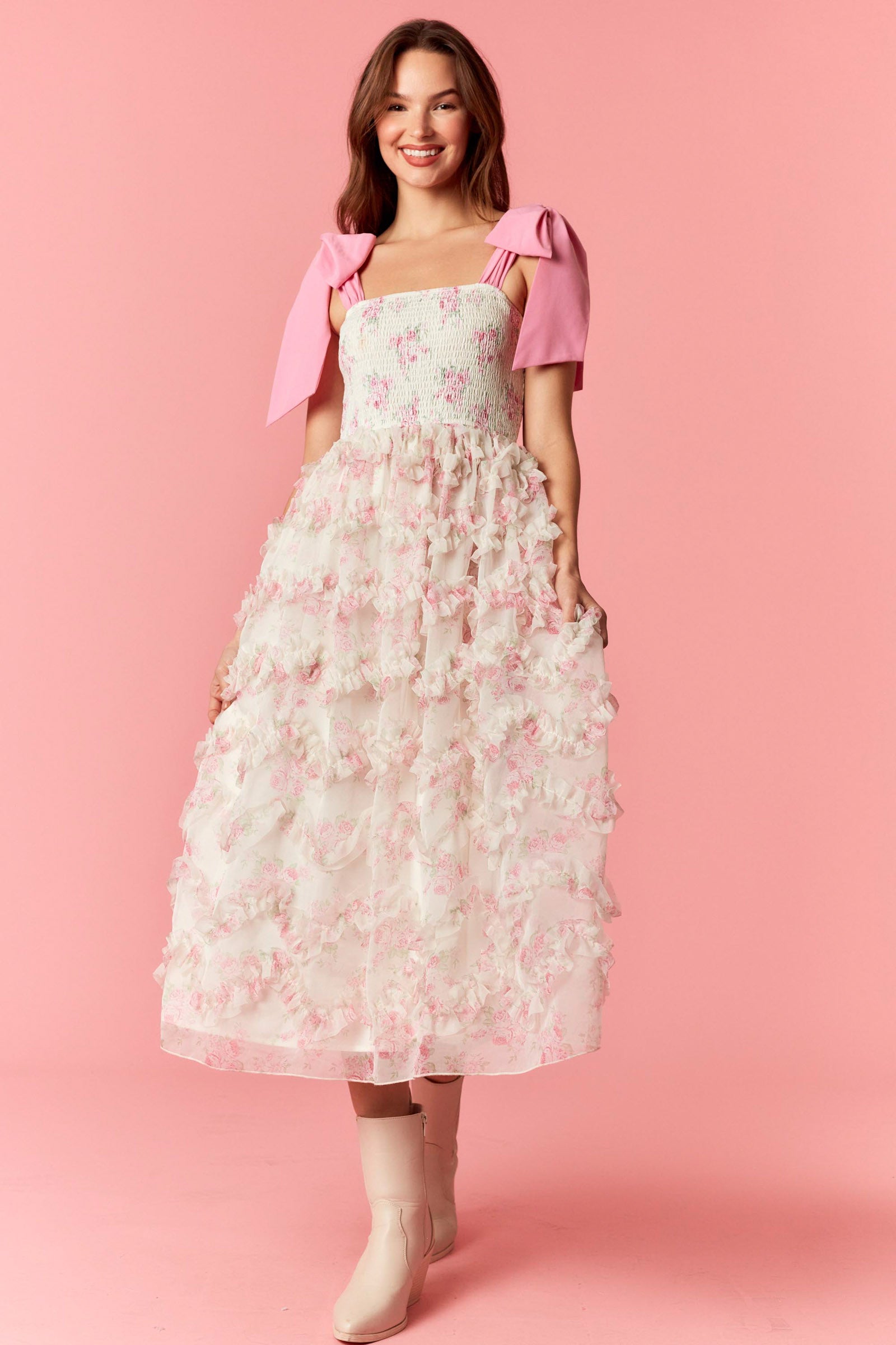 Bow Tie Strap with Floral Printed Smocking Top with Ruffle Detailed Flared Organza Midi Dress